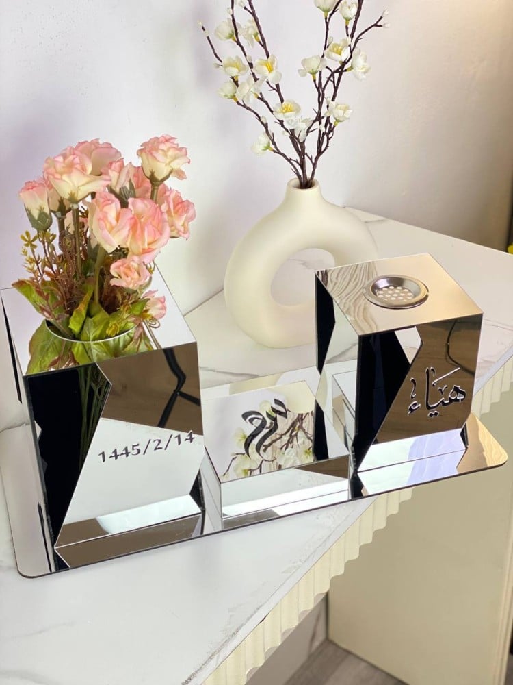 3- مبخرة بكس البخور وستاند مسكة أو فازة ورد وصينية .